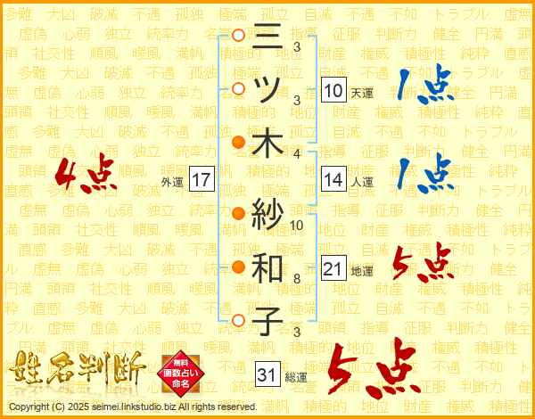 三(3画)ツ(3画)木(4画) 紗(10画)和(8画)子(3画)