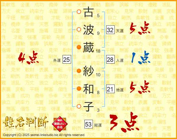 古(5画)波(9画)蔵(18画) 紗(10画)和(8画)子(3画)