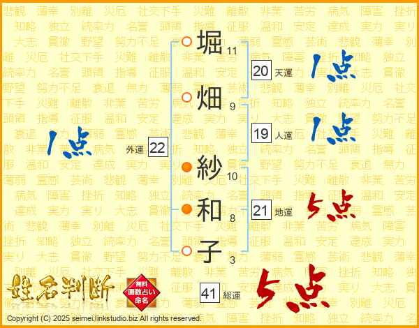 堀(11画)畑(9画) 紗(10画)和(8画)子(3画)