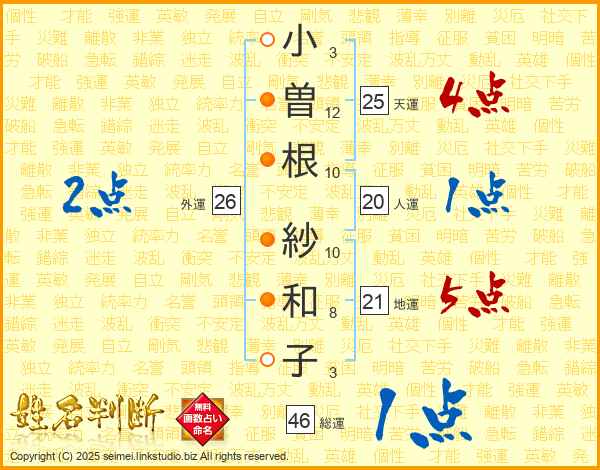 小(3画)曽(12画)根(10画) 紗(10画)和(8画)子(3画)