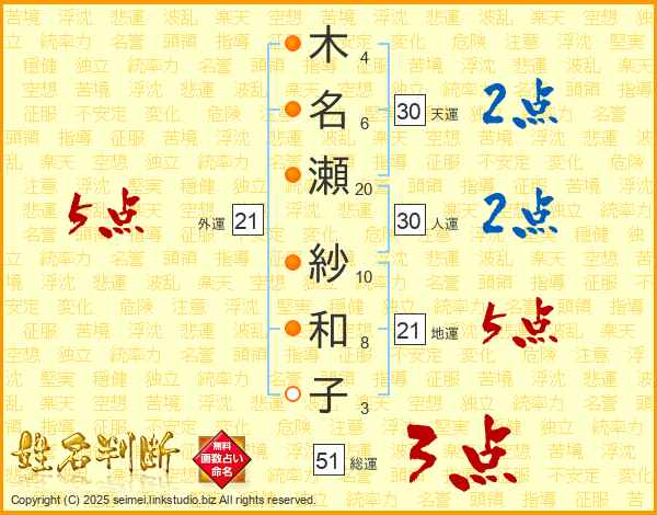 木(4画)名(6画)瀬(20画) 紗(10画)和(8画)子(3画)