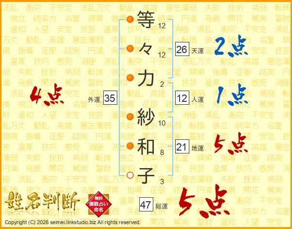 等(12画)々(12画)力(2画) 紗(10画)和(8画)子(3画)