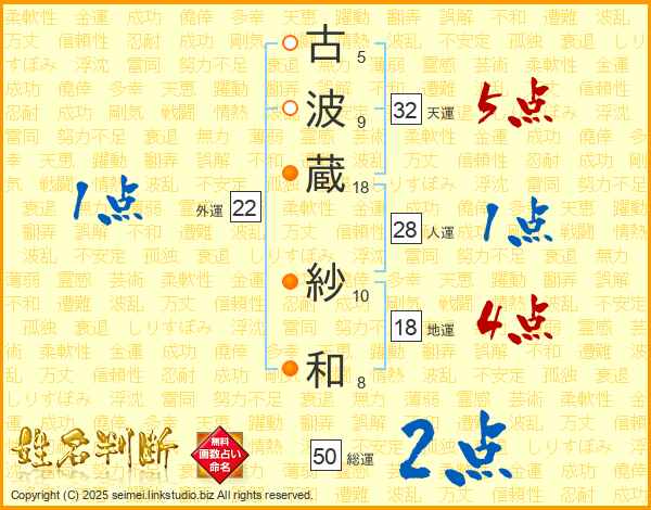 古(5画)波(9画)蔵(18画) 紗(10画)和(8画)