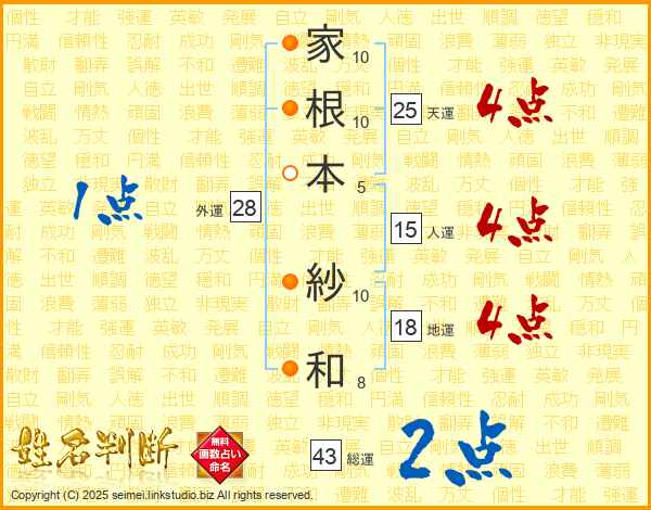 家根本紗和さんの天運は25画の4点!