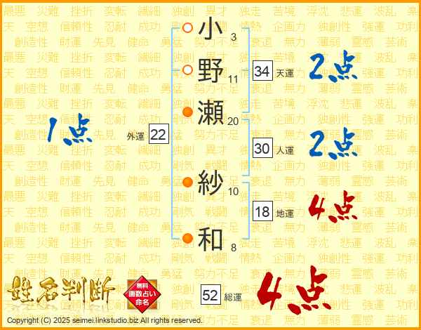 小(3画)野(11画)瀬(20画) 紗(10画)和(8画)