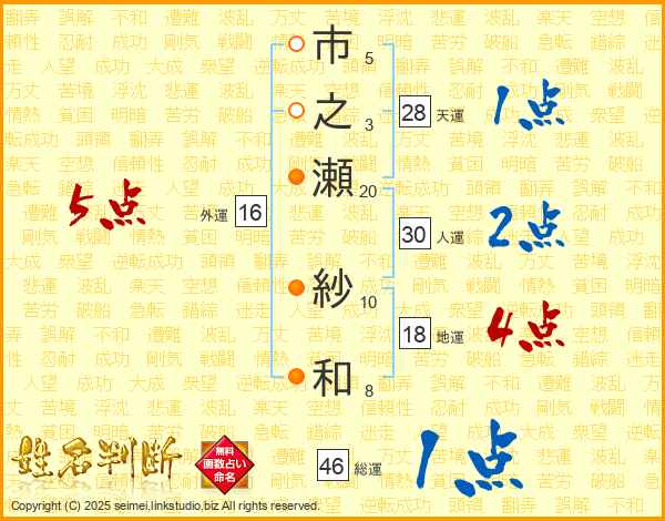 市(5画)之(3画)瀬(20画) 紗(10画)和(8画)