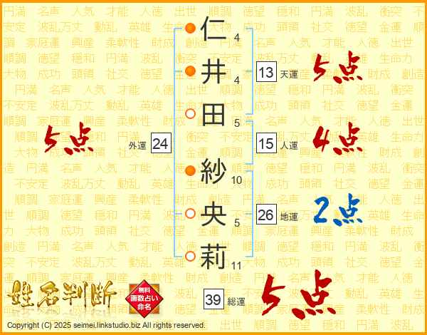 仁(4画)井(4画)田(5画) 紗(10画)央(5画)莉(11画)