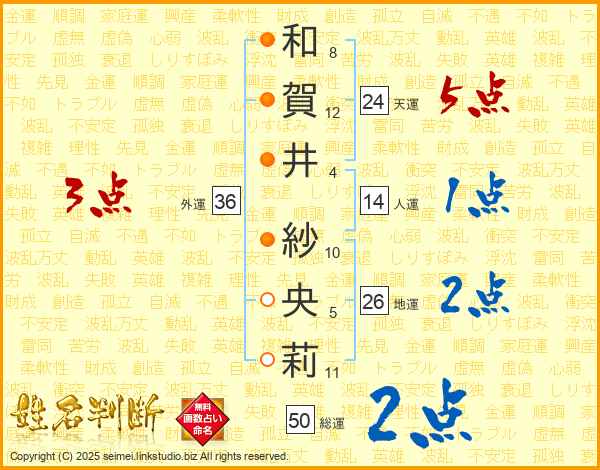 和(8画)賀(12画)井(4画) 紗(10画)央(5画)莉(11画)