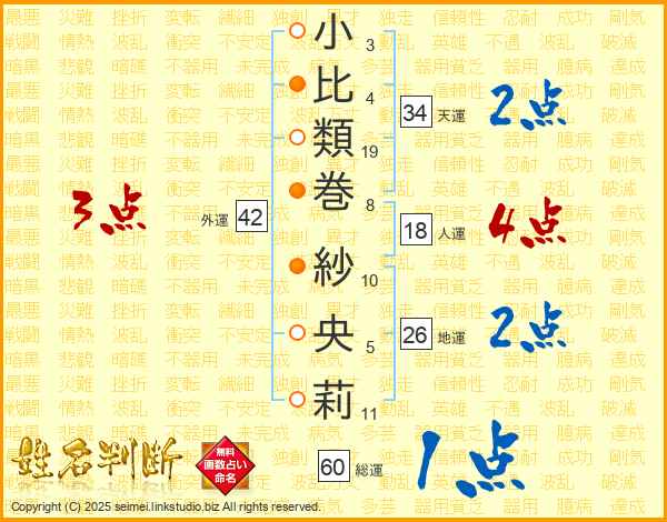 小(3画)比(4画)類(19画)巻(8画) 紗(10画)央(5画)莉(11画)