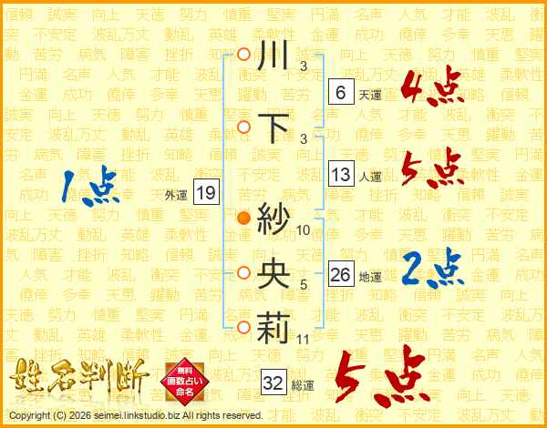 川(3画)下(3画) 紗(10画)央(5画)莉(11画)