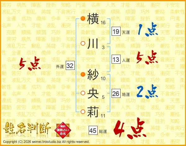 横川紗央莉さんの総運は45画の4点!