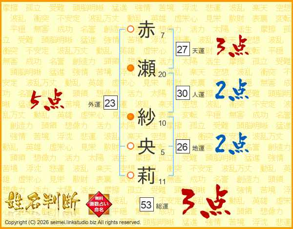 赤(7画)瀬(20画) 紗(10画)央(5画)莉(11画)
