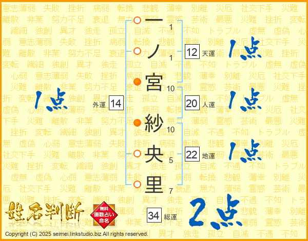 一(1画)ノ(1画)宮(10画) 紗(10画)央(5画)里(7画)