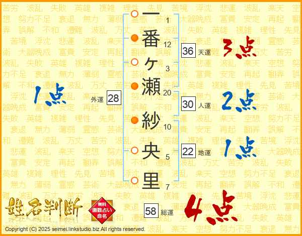 一番ヶ瀬紗央里さんの総運は58画の4点!