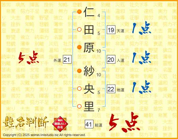 仁(4画)田(5画)原(10画) 紗(10画)央(5画)里(7画)