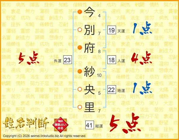 今(4画)別(7画)府(8画) 紗(10画)央(5画)里(7画)