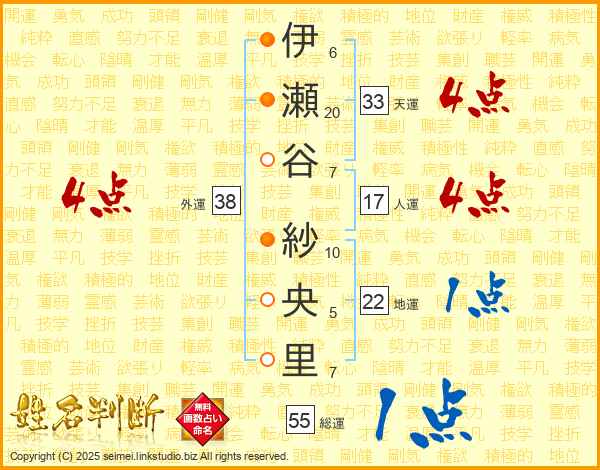 伊(6画)瀬(20画)谷(7画) 紗(10画)央(5画)里(7画)