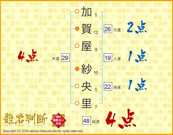 加賀屋紗央里さんの総運は48画の4点!