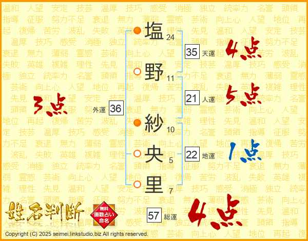 塩(24画)野(11画) 紗(10画)央(5画)里(7画)