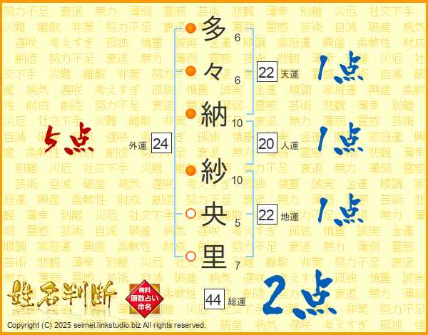 多(6画)々(6画)納(10画) 紗(10画)央(5画)里(7画)