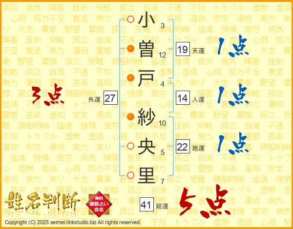 小(3画)曽(12画)戸(4画)  紗(10画)央(5画)里(7画)