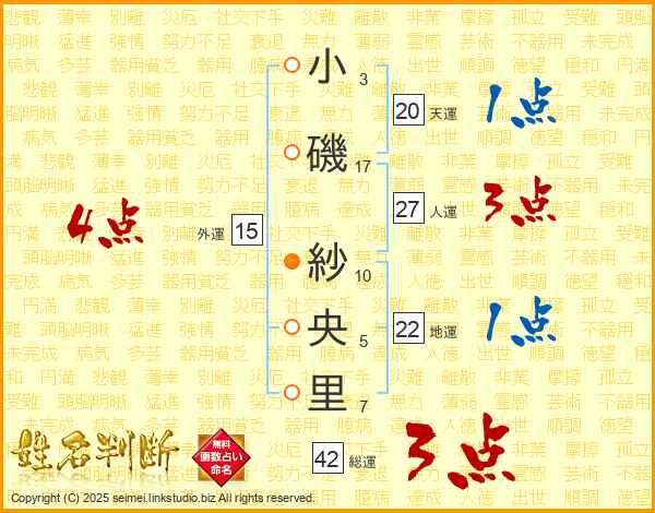 小(3画)磯(17画) 紗(10画)央(5画)里(7画)