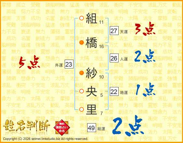組(11画)橋(16画) 紗(10画)央(5画)里(7画)