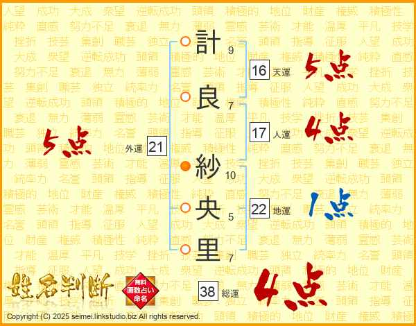 計(9画)良(7画) 紗(10画)央(5画)里(7画)