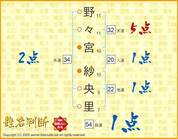 野(11画)々(11画)宮(10画) 紗(10画)央(5画)里(7画)
