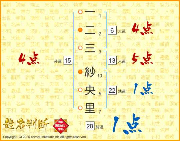 一(1画)二(2画)三(3画) 紗(10画)央(5画)里(7画)