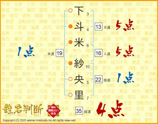 下(3画)斗(4画)米(6画) 紗(10画)央(5画)里(7画)
