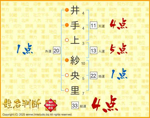 井(4画)手(4画)上(3画) 紗(10画)央(5画)里(7画)