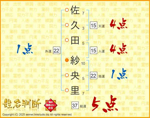 佐(7画)久(3画)田(5画) 紗(10画)央(5画)里(7画)