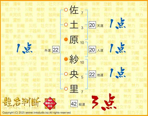 佐(7画)土(3画)原(10画) 紗(10画)央(5画)里(7画)