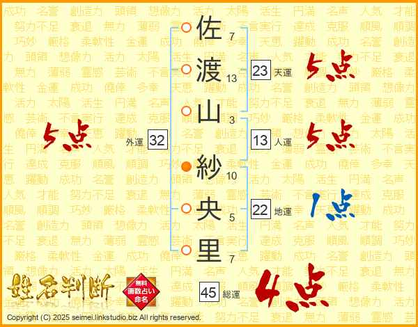 佐(7画)渡(13画)山(3画) 紗(10画)央(5画)里(7画)