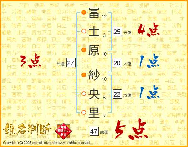 冨(12画)士(3画)原(10画) 紗(10画)央(5画)里(7画)