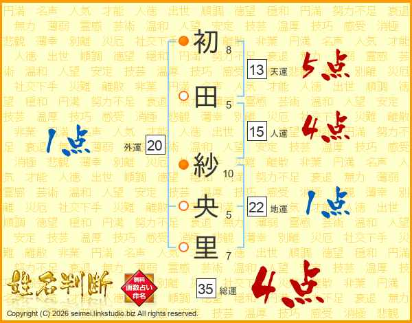 初(8画)田(5画) 紗(10画)央(5画)里(7画)