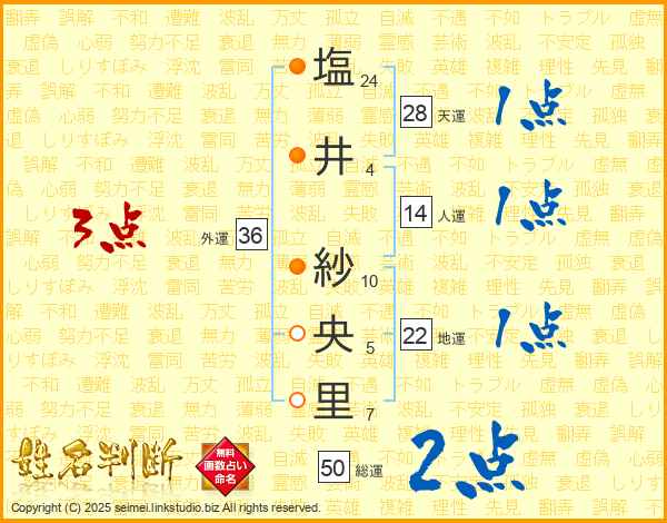 塩(24画)井(4画)  紗(10画)央(5画)里(7画)
