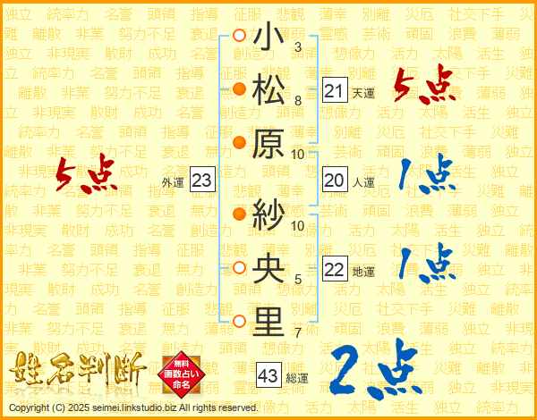 小(3画)松(8画)原(10画) 紗(10画)央(5画)里(7画)