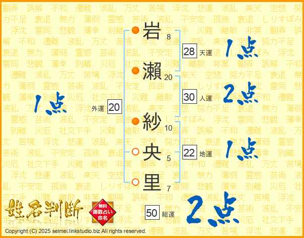 岩(8画)瀨(20画) 紗(10画)央(5画)里(7画)