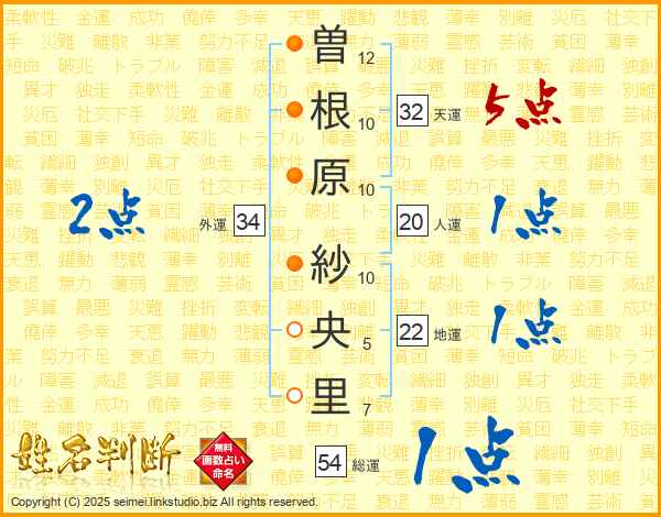 曽(12画)根(10画)原(10画) 紗(10画)央(5画)里(7画)