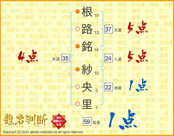 根(10画)路(13画)銘(14画) 紗(10画)央(5画)里(7画)