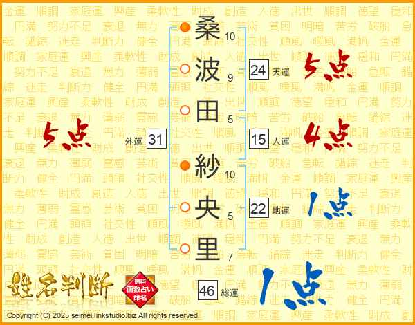 桑(10画)波(9画)田(5画) 紗(10画)央(5画)里(7画)
