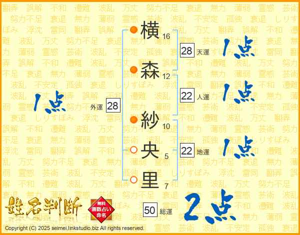 横(16画)森(12画) 紗(10画)央(5画)里(7画)