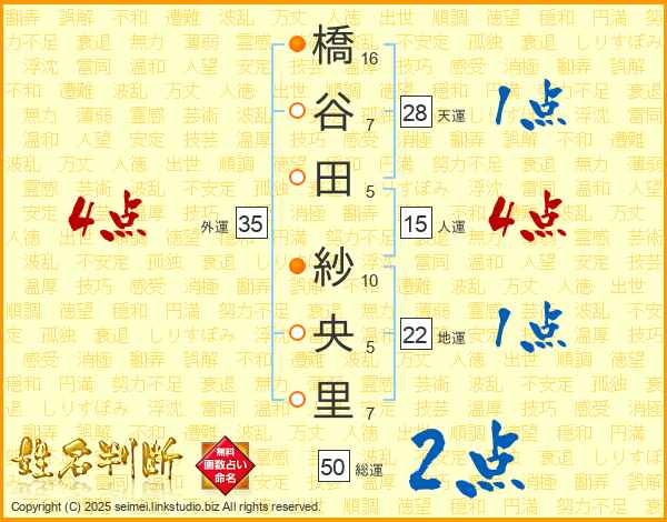 橋(16画)谷(7画)田(5画) 紗(10画)央(5画)里(7画)