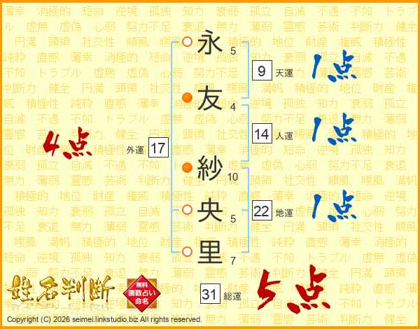 永(5画)友(4画) 紗(10画)央(5画)里(7画)