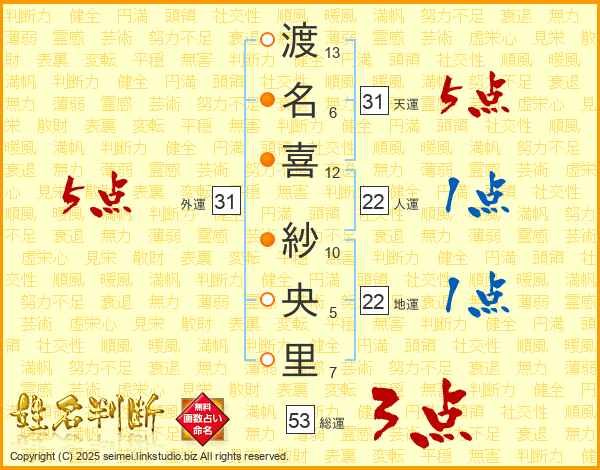渡(13画)名(6画)喜(12画) 紗(10画)央(5画)里(7画)