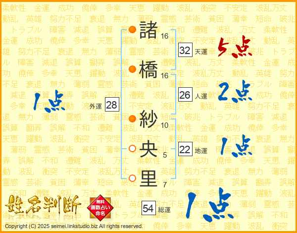 諸(16画)橋(16画) 紗(10画)央(5画)里(7画)