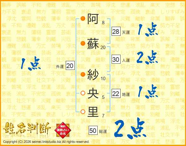 阿(8画)蘇(20画) 紗(10画)央(5画)里(7画)