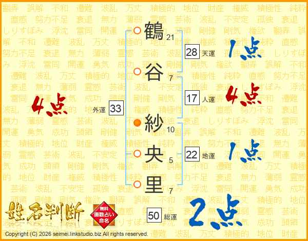 鶴(21画)谷(7画) 紗(10画)央(5画)里(7画)